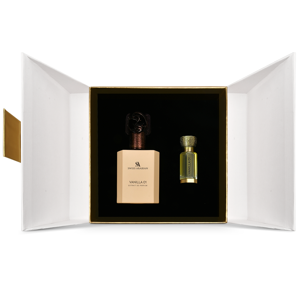 يجمع هذا المزيج الحصري بين عطر Vanilla 01 Extrait de Parfum وزيته العطري المطابق. تبدأ الرائحة بنفحات الفلفل الوردي وزهر البرتقال وجوز الهند الكريمي، لتنتقل إلى قلب غني من الياسمين السامباك ومسك الروم والكابتشينو والكراميل. ومع استقرارها، تترك نفحات الفانيليا بوربون وحبوب التونكا وخشب الصندل والمسك أثراً ناعماً يدوم طويلاً مع عمق مريح. يمكن استخدام كل عطر على حدة أو مزجهما معاً لتعزيز ثراء الرائحة وانتشارها وثباتها، مما يخلق بصمة جريئة وراقية في آن واحد.